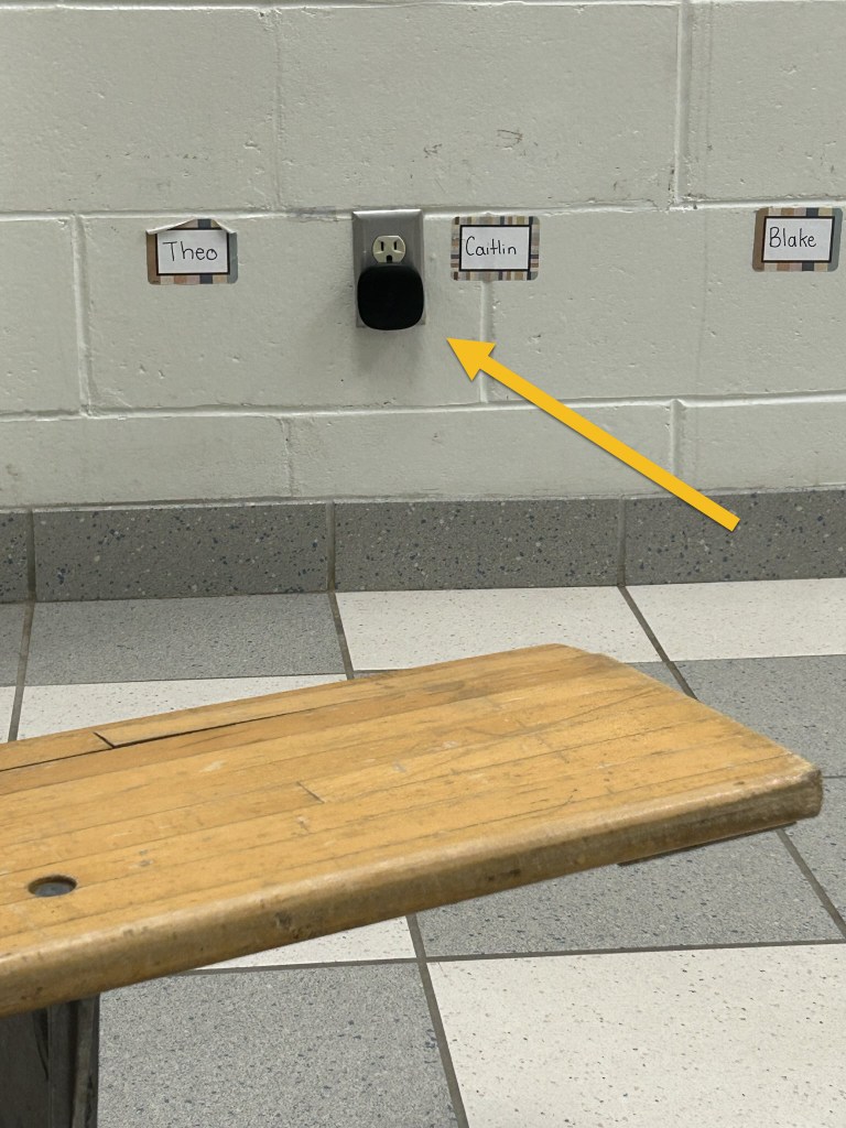 Plug the doorbell ringer into the wall outlet near the gym door. (See image below.) Take the doorbell button (in its Ziploc bag, with sticky painters tape on it) to the front door. Stick the doorbell button to the outside of the entry door, where people will see it. (See image below.)